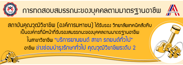 แผนกวิชาช่างยนต์ รับสมัครทดสอบสมรรถนะ อาชีพช่างซ่อมบำรุงรักษาทั่วไป คุณวุฒิวิชาชีพระดับ 2