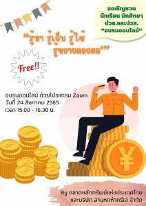 เชิญชวนคณะครู นักเรียน นักศึกษาเข้าร่วมกิจกรรมการอบรมออนไลน์ หัวข้อ 'รู้หา รู้เก็บ รู้ใช้ รู้ขยายดอกผล' ผ่านโปรแกรม Zoom ในวันที่ 24 สิงหาคม 2565 เวลา 15.00 - 16.30 น.